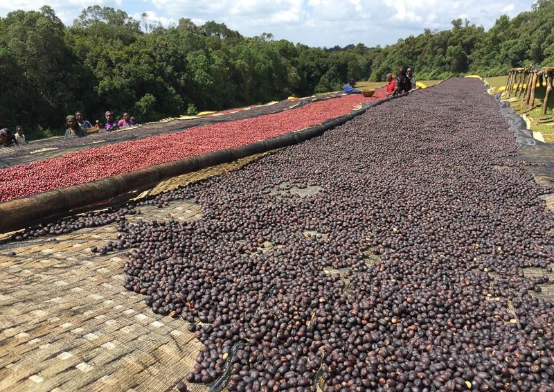 Most of the coffee from Ethiopia is naturally processed, which means that they are sun dried with the cherry fruit still attached to the coffee bean. This processing method gives the coffee fruity or winey tones and bright acidity